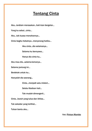Tiada bimbang tiada ragu tak ingin aku jauh dariMu kuingin hidup bagiMu Yesus. Lama sudah ku cinta padamu meski di hati hanya terpaku karena hidup kita berbeda kau telah berdua kini ku yang merana. Lirik Lagu Malaysia.